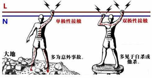 雙極性接觸觸電:即人體同時接觸火線與零線,形成回路,而無需經過大地,所以此時絕緣鞋不起作用,這種觸電情況多為自殺或他殺,發(fā)生機率很小。